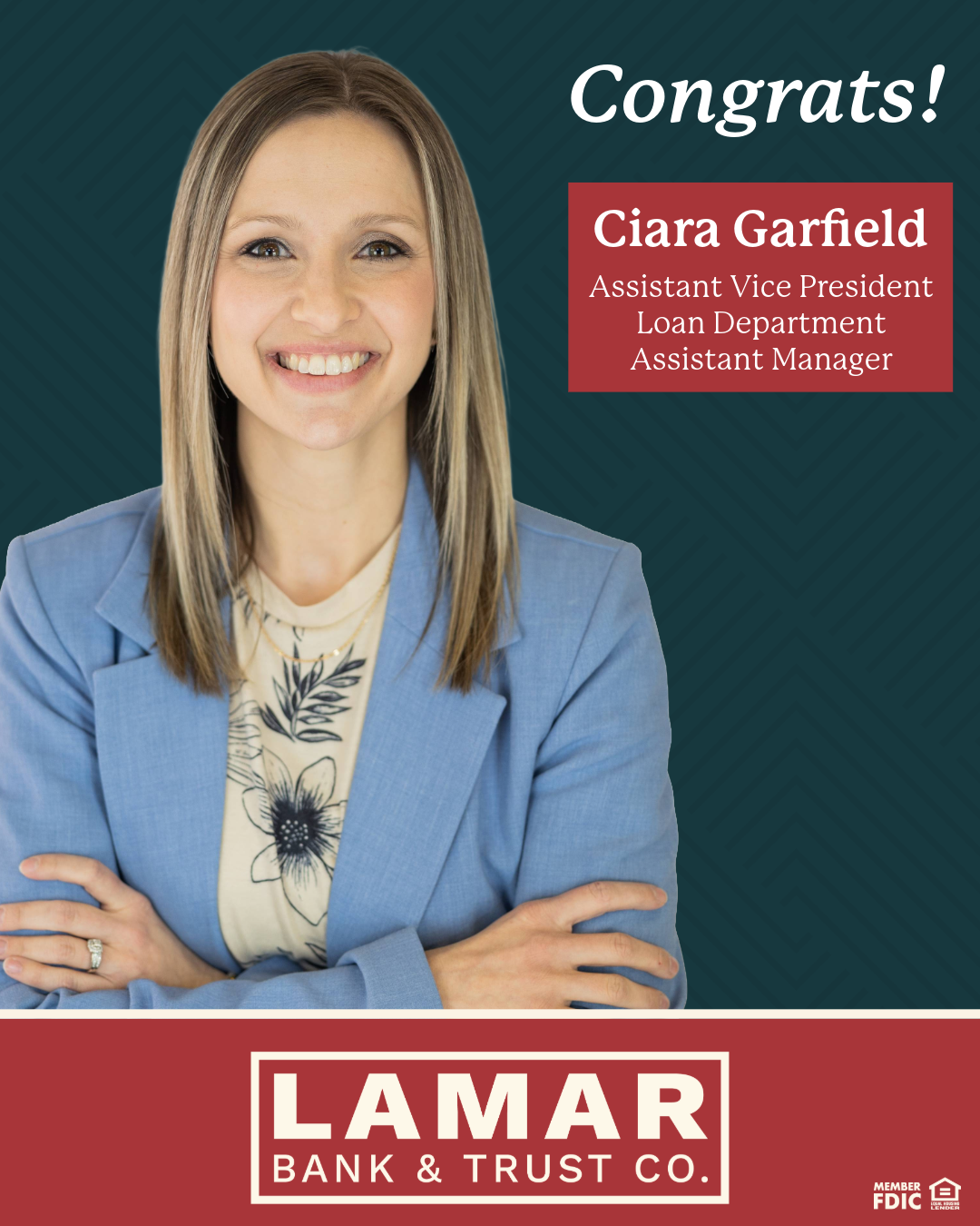 Pat O’Neal, President & CEO, expressed his enthusiasm: “Could not be more pleased with the contributions of Ciara and Crystal. Congratulations to both of them on their deserved promotions and responsibilities.” Both promotions reflect Lamar Bank and Trust’s commitment to nurturing talent and providing employees with opportunities to grow professionally while continuing to provide excellent service to the community.